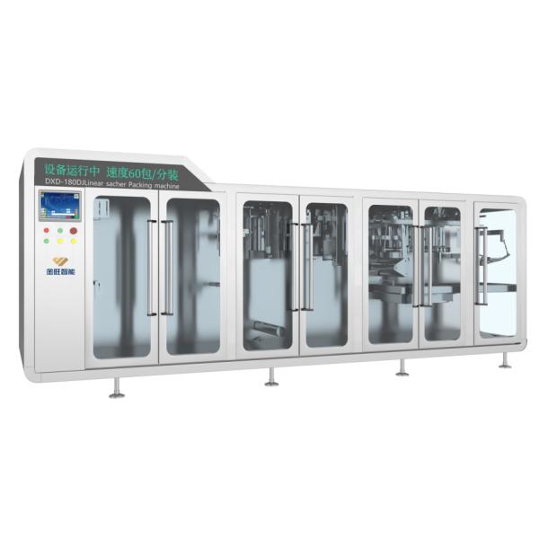 DXD-180DJ Automatic horizontal pouches packing machine consists of motor film release, bag forming, bag bottom sealing, vertical sealing, servo bag pulling, shearing, bag opening inspection, bag opening filling, bag transfer, bag dusting and dust removal, bag top sealing and other mechanisms. The coordinated action of each mechanism is completed by the cam on the main shaft driven by the motor, and the position signal is feedback by the encoder on the main shaft under the programmable control of PLC. The main machine adopts standard stripe sealing, and the filling device can be replaced to realize the automatic filling of various materials such as powder, granule, suspending agent, emulsion, water agent and so on. The whole machine is made of SUS304, which has good anti-corrosion effect on highly corrosive materials. Toughened glass cover prevents dust leakage, which is more environmentally friendly and pollution-free.